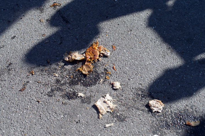 Am Trottoir flackan drei Larifari, oan hams oobissn, daneem bappt a Nosnramme. Weiße, greane und braune Glasscherm lieng aa umanand, zwoa Oachkatzlschwoafin, a Dingolfing, a Holz-vor-der-Hüttn im Miniaturformat als Anhänger von am Schlissl und a Zigarrettn, wo no a greana Lunganharing drobappt. Zwoa Wrdlbrmft und a oafchacherner Zwiefacher lieng aa dabei. Arschlings sihgt mer a oroschne Lackn Gschpeiberts. Und überoi flackan Zibebn und griebner Kren. Des, sog i, des duasd amal promptn und na lasst des vo der KI fotografiern!“