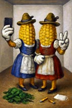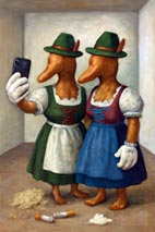 Mache ein querformatiges Ölgemälde folgenden Inhalts: da öffnen sich die Wolken und mit blinzelnden Augen treten achtzehn Packträger hervor und verkünden das Ende der Welt.Links und rechts stehen je vier goldene Jungfrauen mit Semmelbrösel bepappt und halten ein vernickeltes Butterbrot in der Hand. Die Luft zitterte wie Schweinesulz, die Erde wühlte sich auf, die Vesuve speiten Honig und Sauerkraut, Nacht- und Tageulen, Glühwürmchen und Lämmergeier schwirrten gespensterhaft auf dem Fußboden umher, panikartig zerplatzte ein alter Leberkäse.